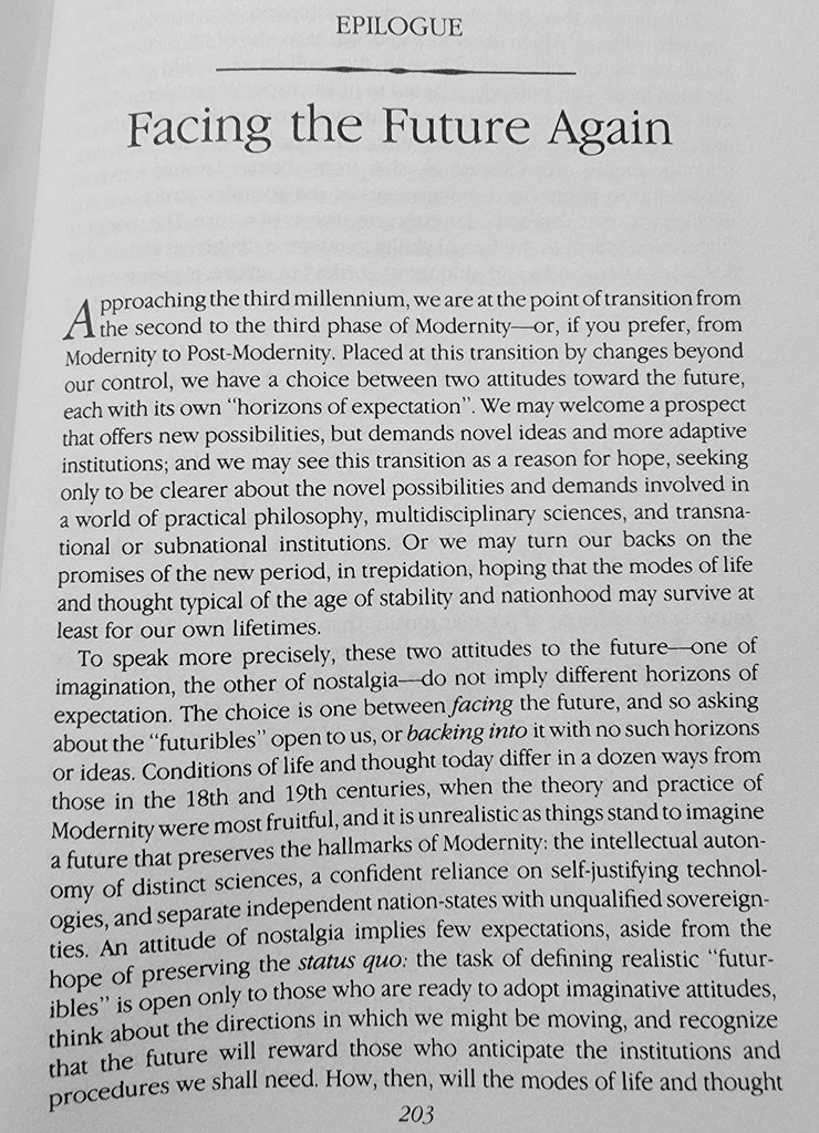 A very interesting series of arguments in favour of leaving rationalism behind and returning to reason. I preferred his earlier Cosmopolis, however (see upthread).